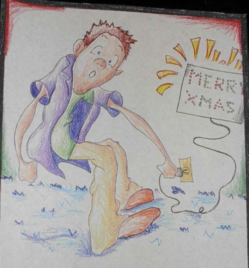 Ix bent down and plugged in their flashing Merry Christmas sign for the front yard.